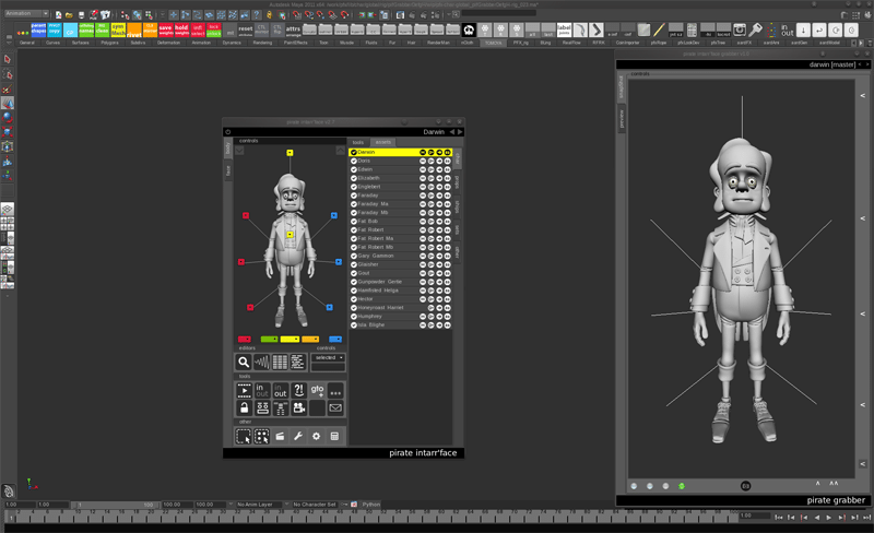The animation team on the Pirates project was a mix of both stop-motion and cg animators. Some were experienced in both. The variety of background meant a variety of requests on the rigging and the tools.I first start with a list of rig features and discuss that with the animation supervisor. After we would agree what should be implemented into the initial rig, a first version is developed and given to the supervisor for testing. At the same time auto-rigging tools scripting process is started.The base rig was built in the way that left us enough room for more advanced upgrades to be performed later in the production. If any updates were requested after the first tests, they would be taken care of before passing the rig over to the team. Handing over the rig was usually done during a quick meeting where we were able to give a solid introduction to all the features and also get some fresh ideas or requests directly from the animators. Similar meetings were run when developing animation tools to keep them animation super friendly.
