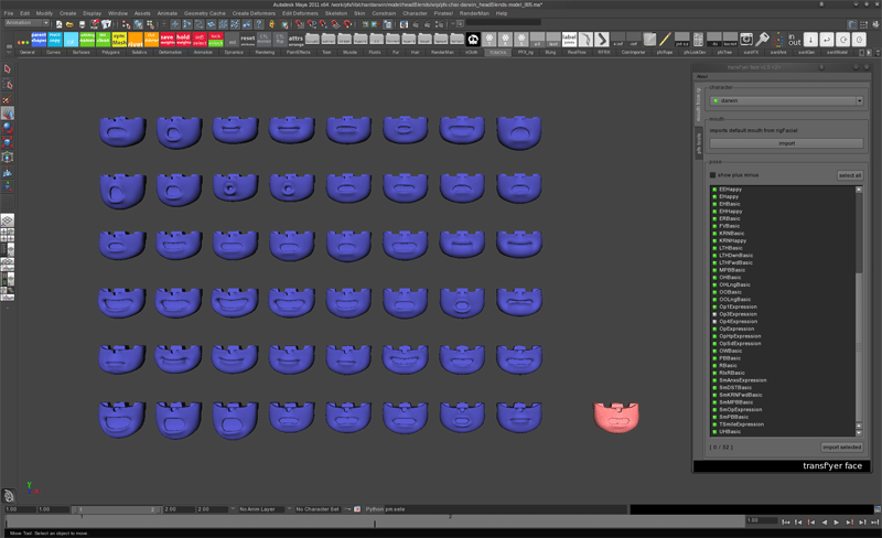 We wrote a Transf’yer Face tool that allowed us to quickly grab any hires mouth that was printed in 3d at the Rapid Prototyping department and quickly map it to our heads with a different topology producing a new blendShape.