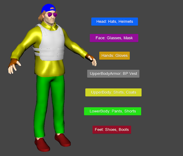 For Radical Heights we decided to do a relatively basic “Paper Doll” setup. We researched the type of clothing we expected the character to wear and defined the most notable areas that we want to be able to customize so we could plan our asset creation accordingly. On the surface this looks easy to create for but it can spiral out of control very quickly from asset creation to in game implementation.