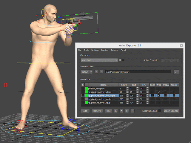I modified the rig and skeleton hierarchy to be able to handle both aspects for animation purposes. The core of the third person skeleton remains untouched aside from various supplemental joints for controlling the camera and upperbody pitching in first person. This is handled by the rig using a single switch that modifies the visibility of various animation controls and changes multiple constraints that affect the behavior of the rig.