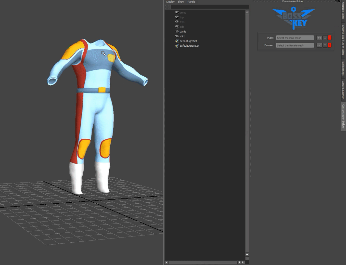 The artist runs the Customization Builder tool, selects the mesh and plugs the selection into the gender specific field. This field is used to determine which rig/skinned mesh the item will be constructed upon. Upon assigning the mesh it is evaluated for poly count, number of uv channels and number of material assignments. It also makes sure the transforms are correct on the mesh before attempting to bind to a skeleton.
