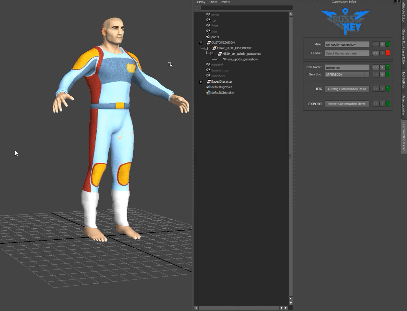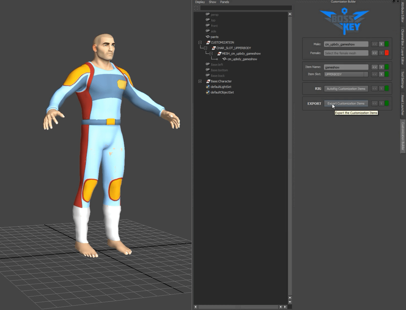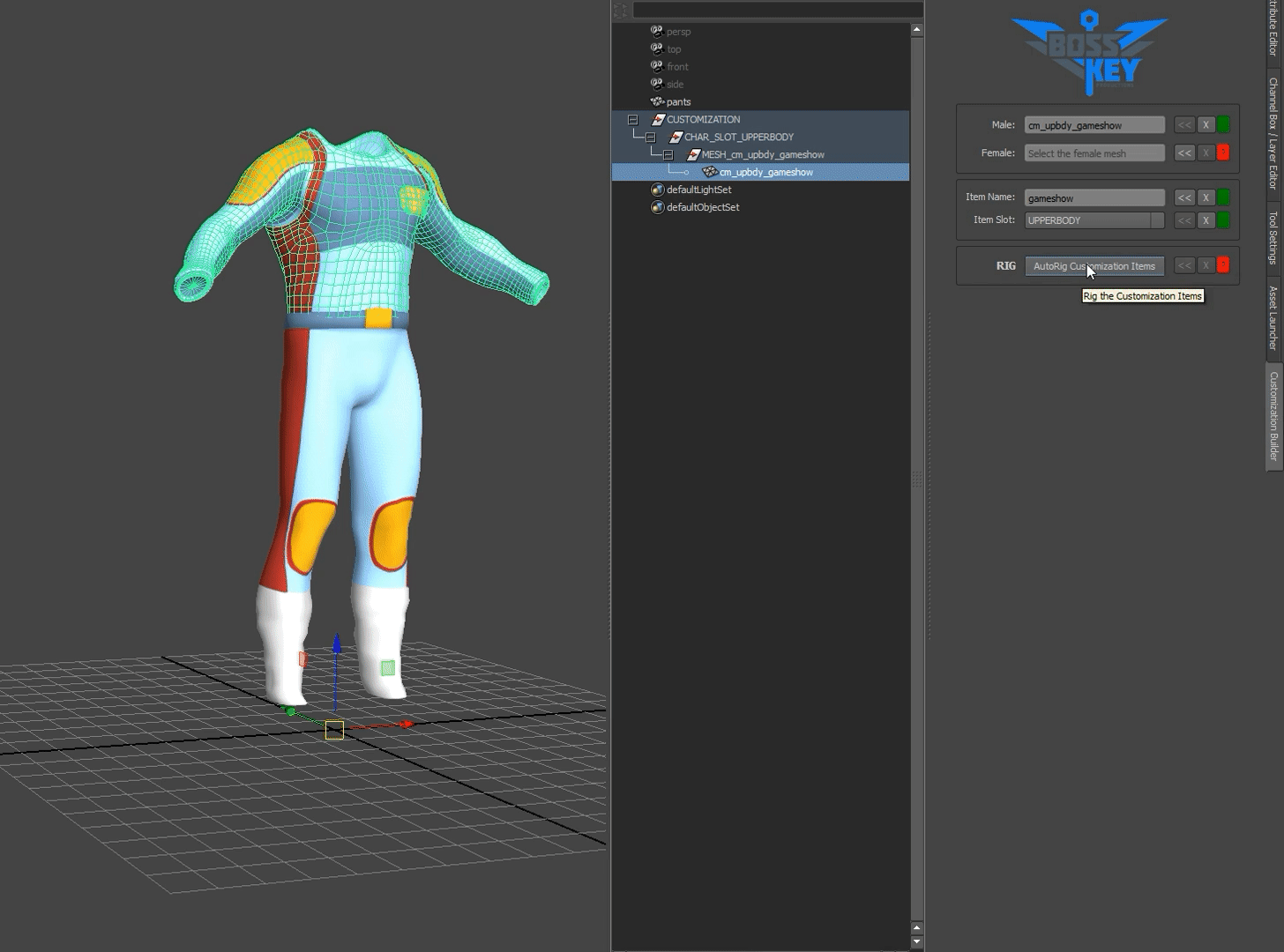 Next we set a unique item name and then we assign the body slot/section for the clothing item. This will rename the mesh accordingly, create an export hierarchy and apply attributes to the groups and meshes used to rig and export the item. These attributes assist the tool when opened later and will also inform the export process how to handle the current asset.