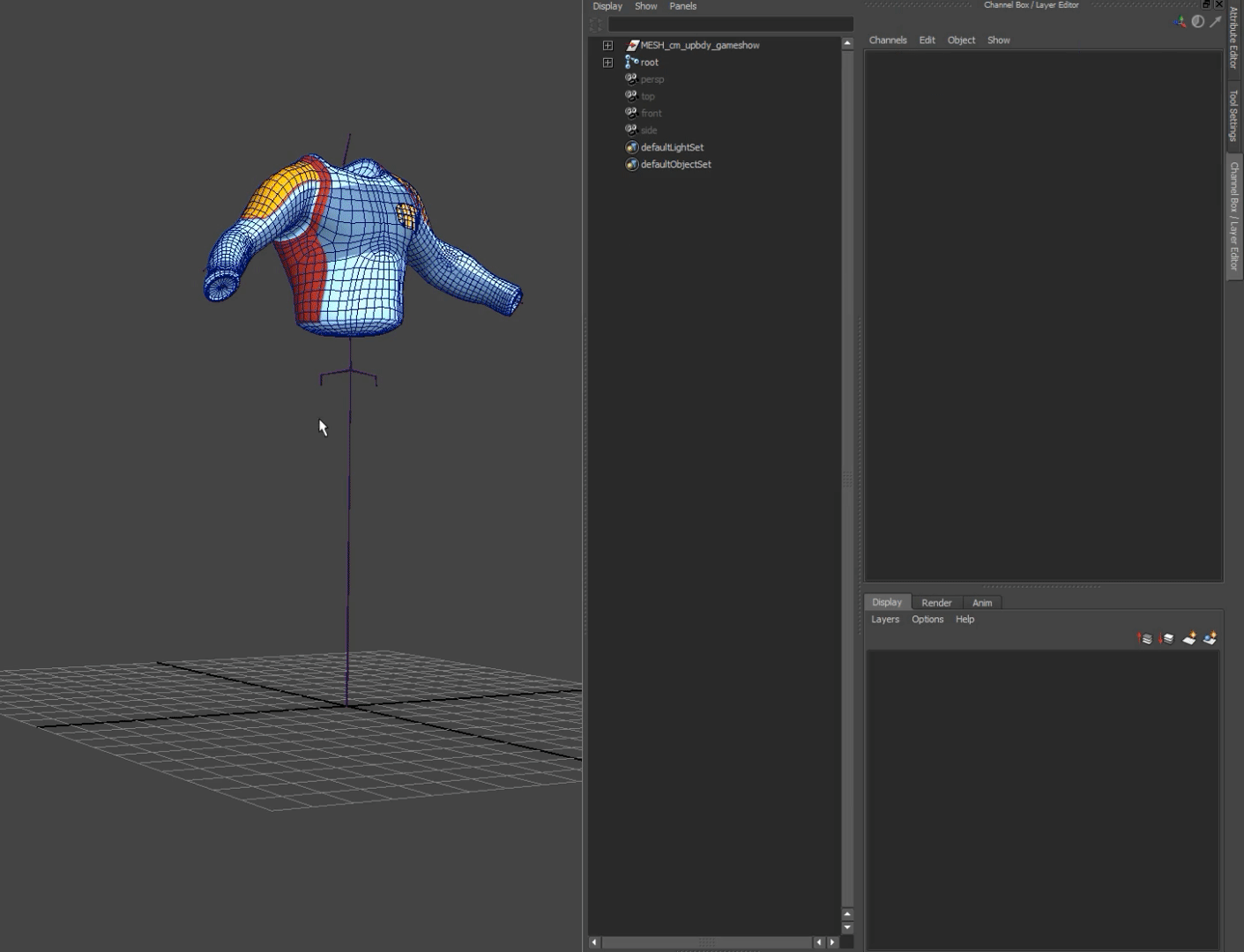 We need to first import the artist created meshes into a clean Maya scene. As mentioned previously the clothing is created for specific sections of the character. In this scene we have a shirt/upperbody and pants/lowerbody.