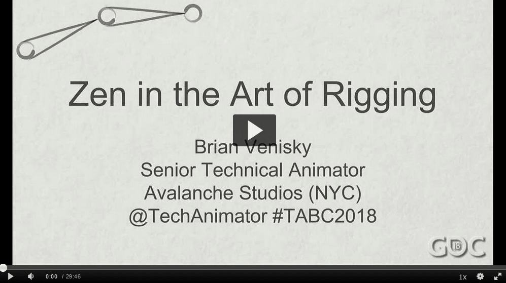 “Rigging is a daunting task that few love, many loathe, and most avoid. For those that do it, some do it by necessity while others truly enjoy it. Regardless of position or skill level though, your approach to rigging and all that it involves is different than the next person. This includes tasks as basic as how you place joints or more advanced ones such as how you calculate mathematical expressions. However, it is not hard for anyone of any level to ignore or forget key concepts and practices that allow for creation of the best possible rigs. There are also many techniques that books, teachers, and tutorials don’t tell you when you’re learning how to rig that could forever go unlearned. This talk will help you focus on better planning of your rigs as well give you essential tips and tricks to building great rigs.”